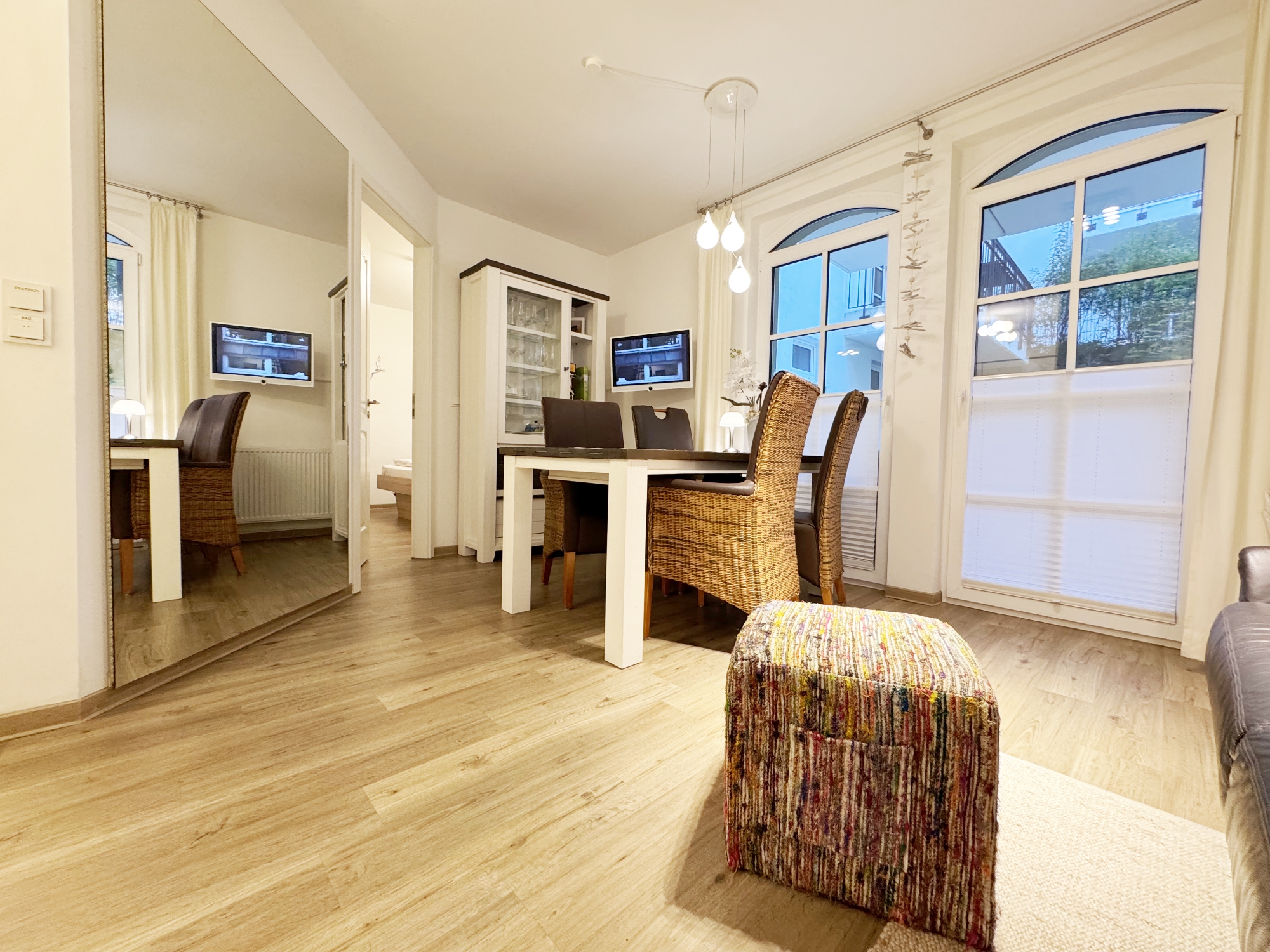 - Wohnbereich ist ausgestattet mit großzügigem Esstisch, zwei Vitrinen im Landhausstil, Couch, Beistelltisch, Leselampe und Flachbild-TV mit integriertem Internetradio. Für den perfekten Sound sorgt das Panasonic iPhone 5, iPad, iPod Micro System, das Bluetooth, CD, USB und FM-Radio unterstützt.