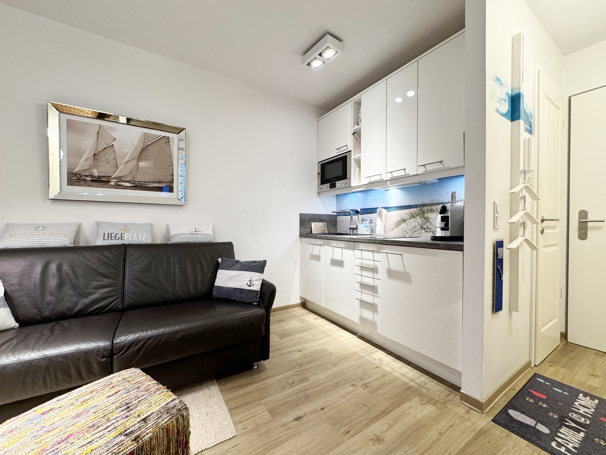 - angrenzende Pantry-Küchenzeile mit 2 Zonen Cerankochfeld, Spülmaschine, Kühlschrank mit Gefrierfach, Handmixer, Toaster, Mikrowelle mit Grill, Kaffeemaschine, De Longhi Nespresso-Maschine und Wasserkocher
