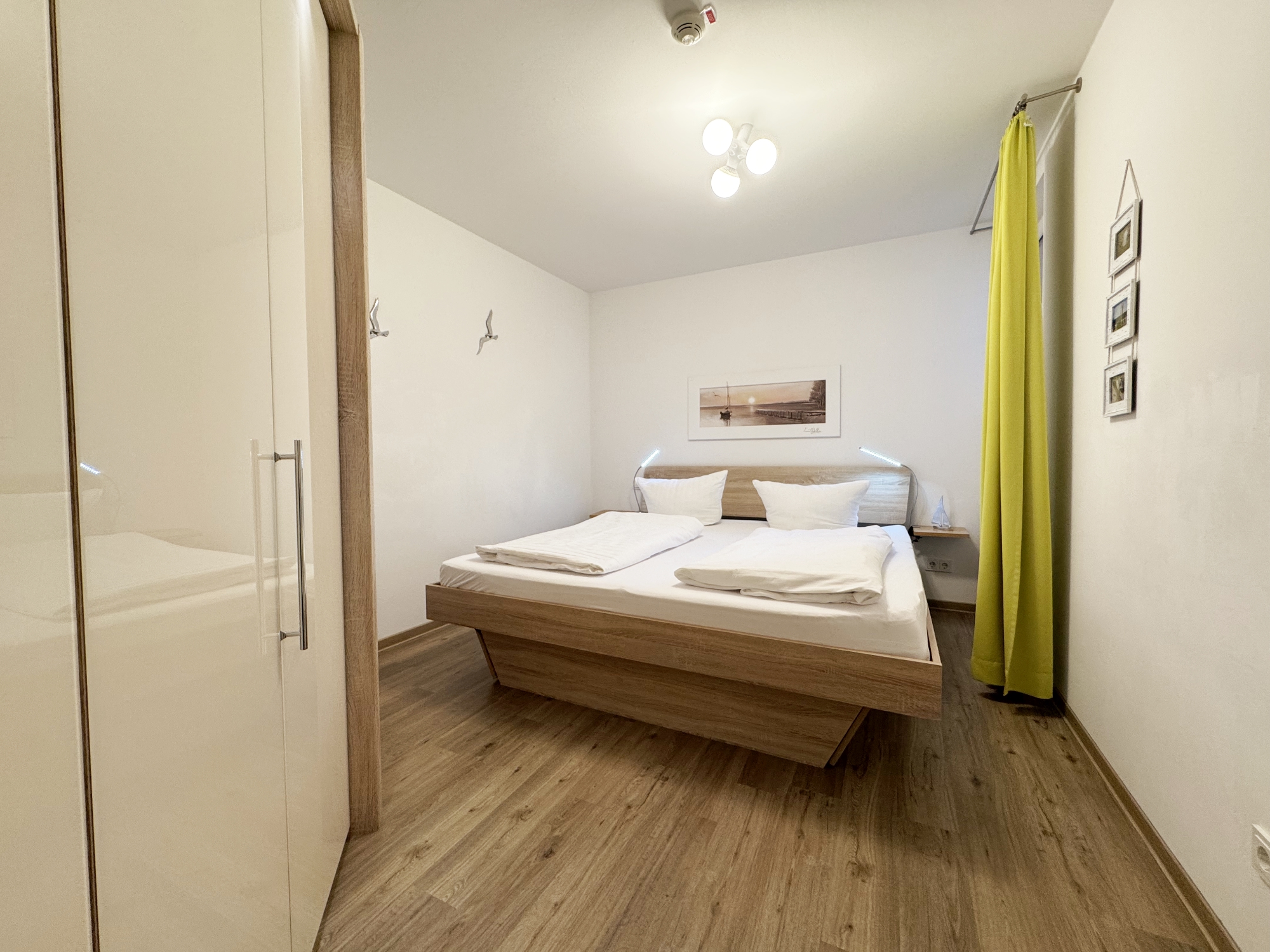 - Schlafzimmer mit stufenlos beheizbarem Wasserbett (2,00m x 2,10m), Nachttischablagen mit Beleuchtung, LED-TV, Kleiderschrank, Tresor, Bücherregal, Insektenschutzgitter sowie Verdunklungsmöglichkeit