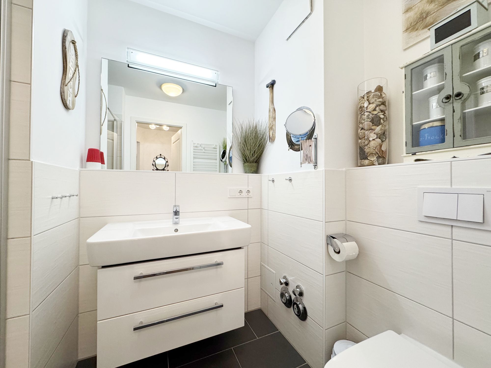 - Badezimmer mit ebenerdiger Glasdusche, WC, Waschplatz, Kosmetikspiegel, Fön sowie einem Schrank