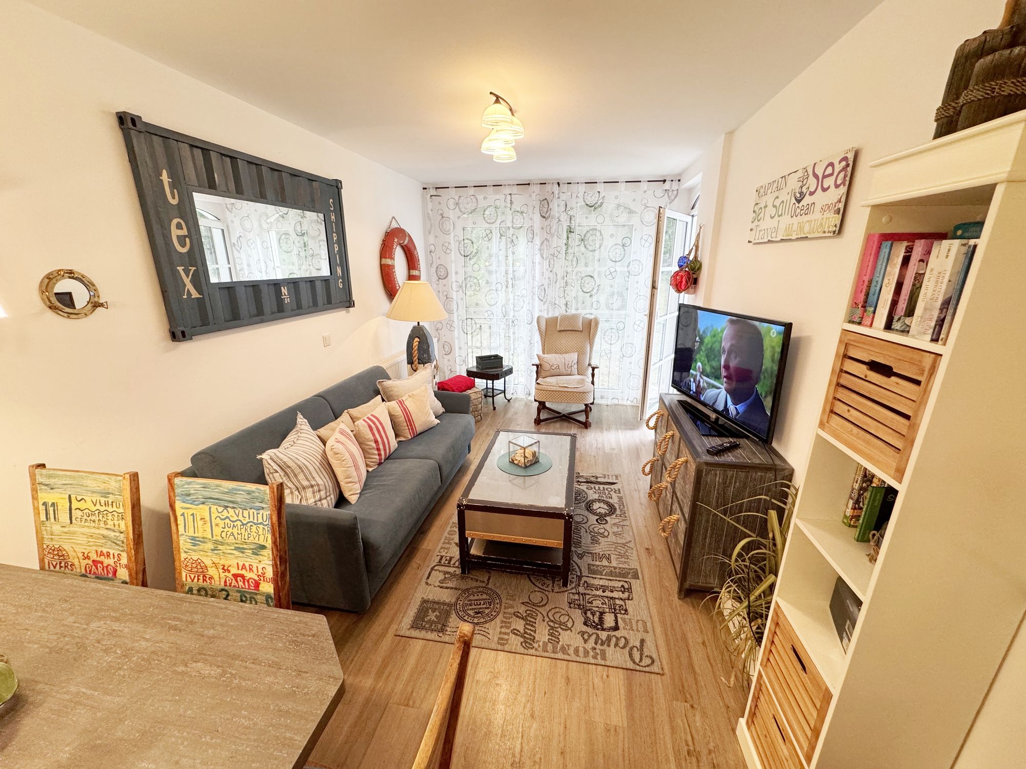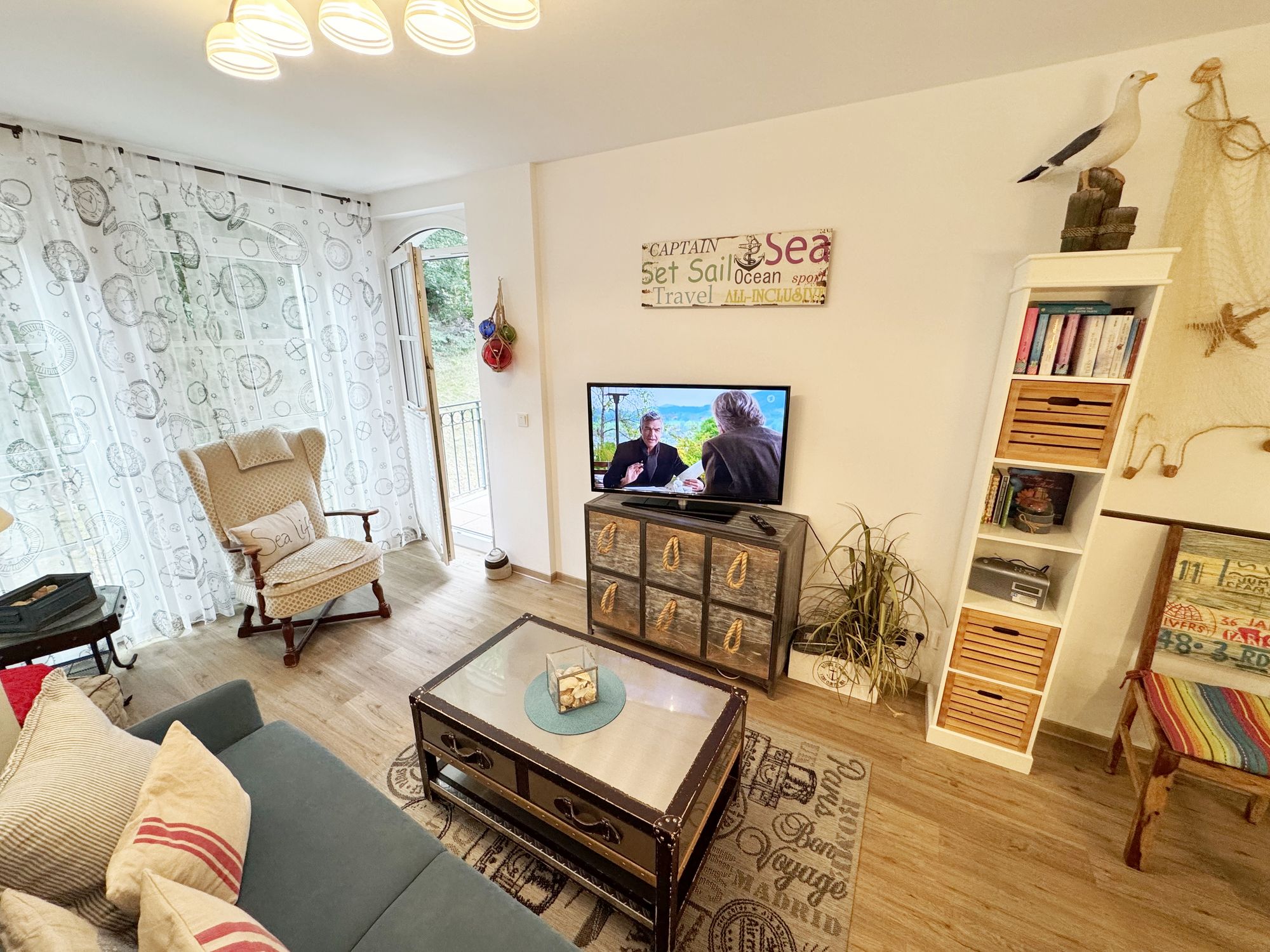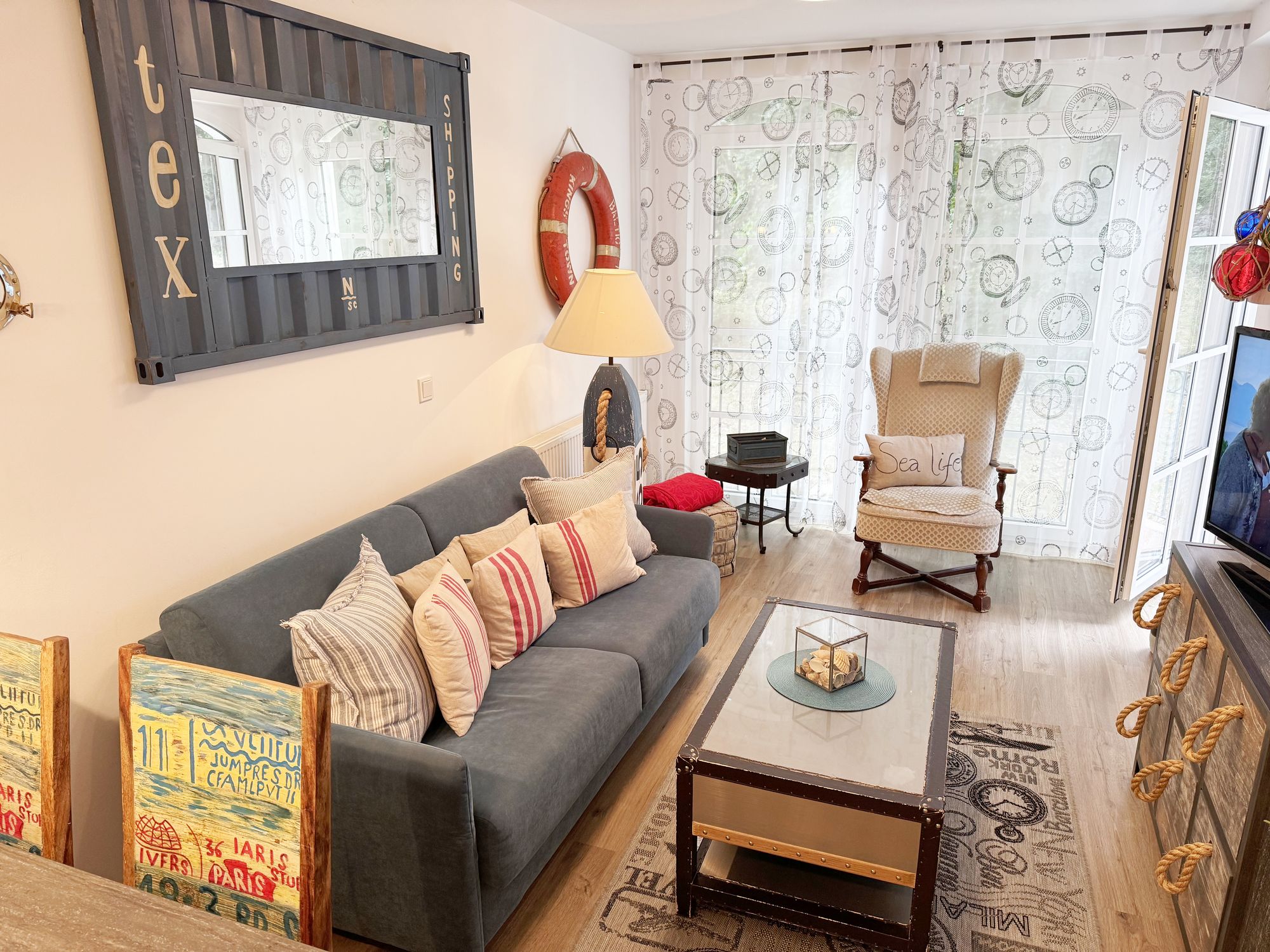 - angrenzender Wohnbereich mit gemütlicher Couch, Sessel, Stehlampe, Couchtisch, Flachbild-TV, DAB-Radio sowie eine kleine Auswahl an Urlaubslektüre