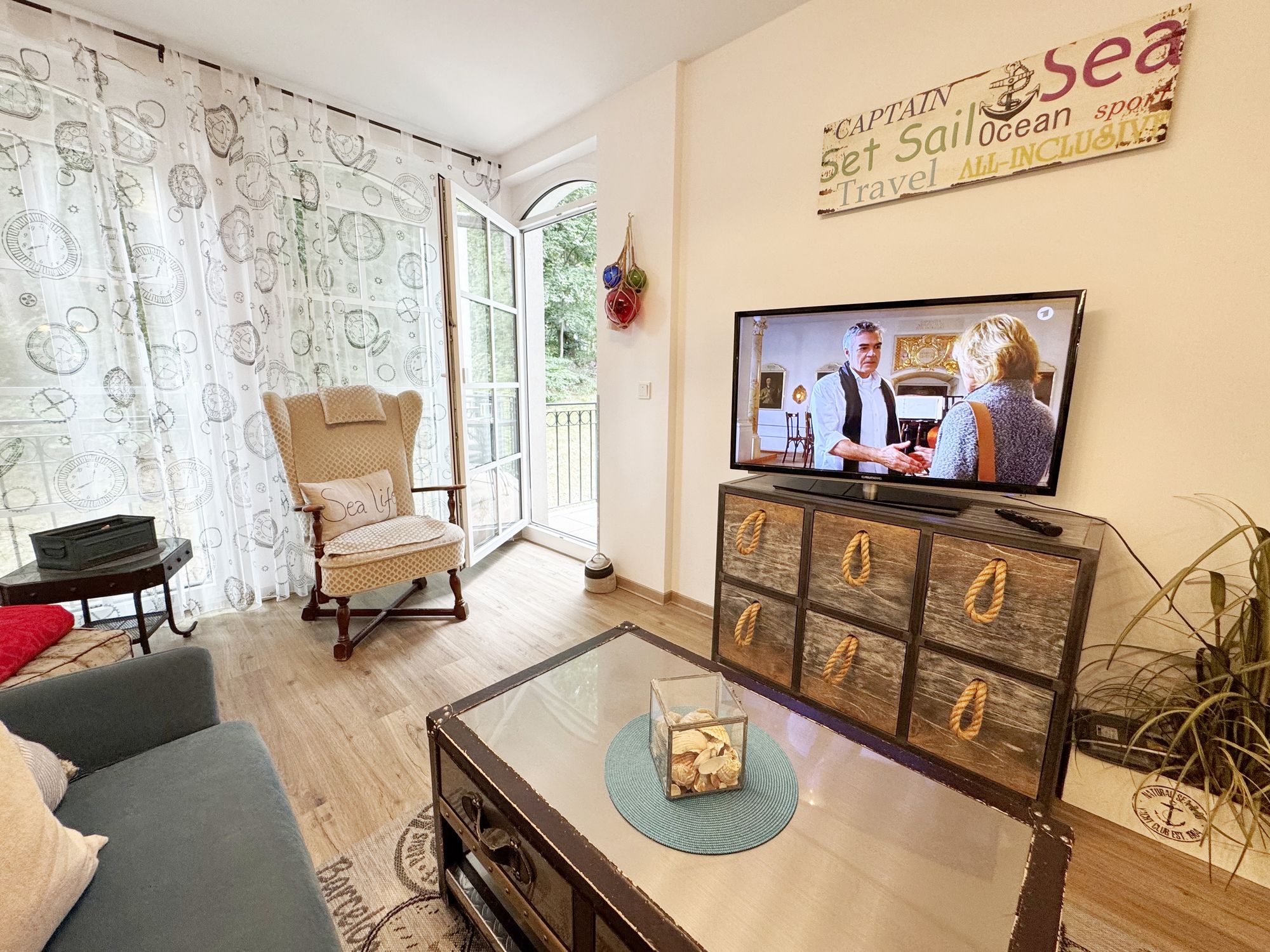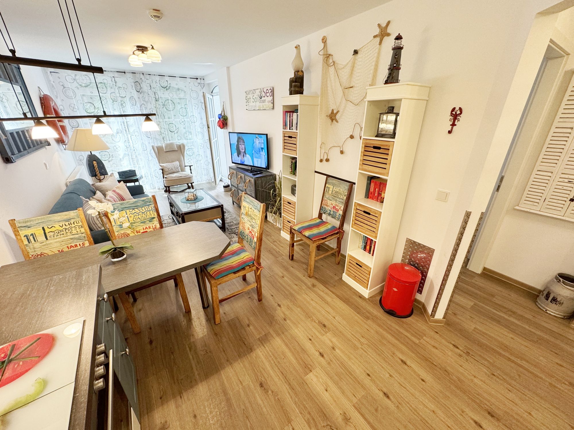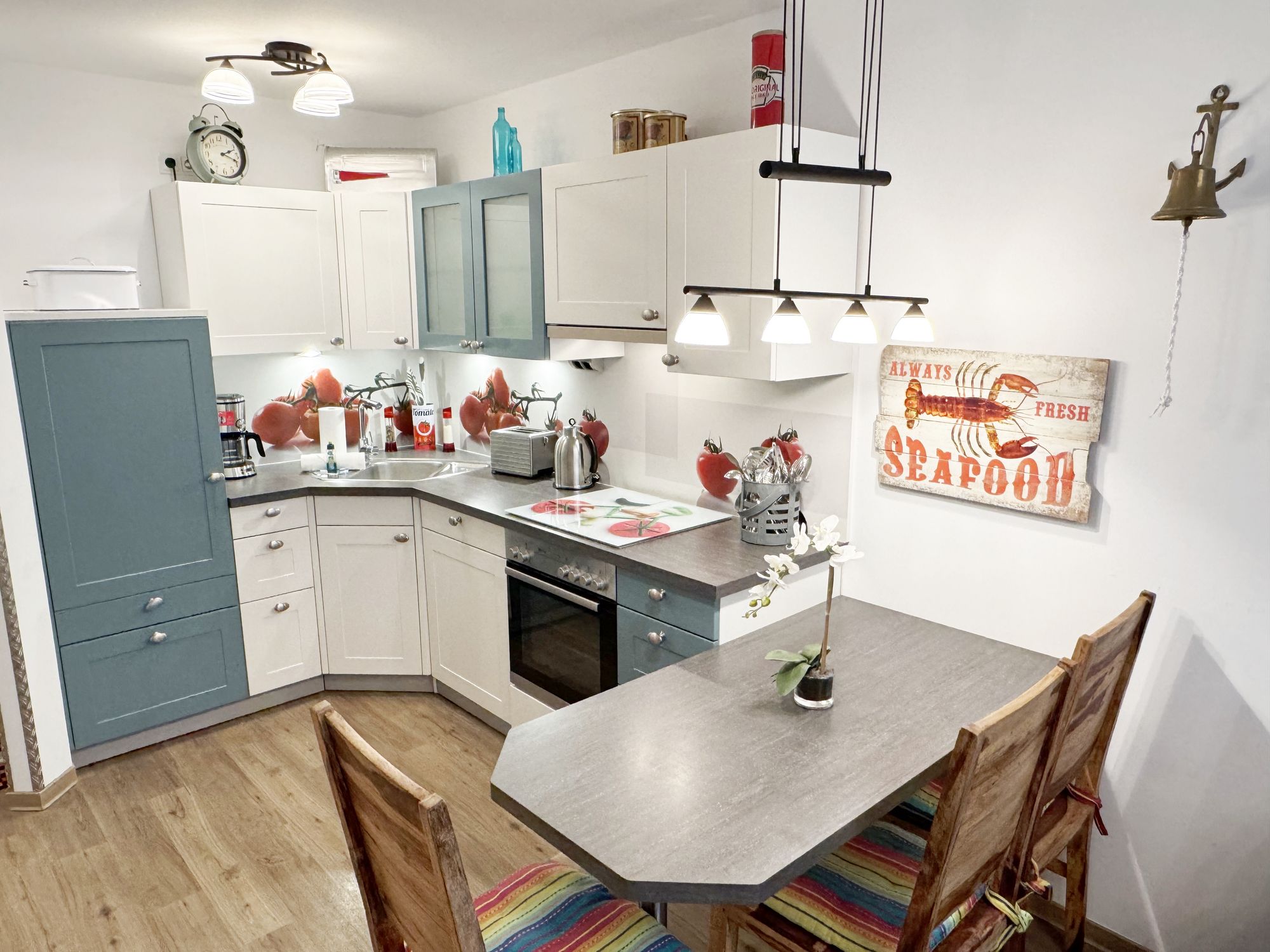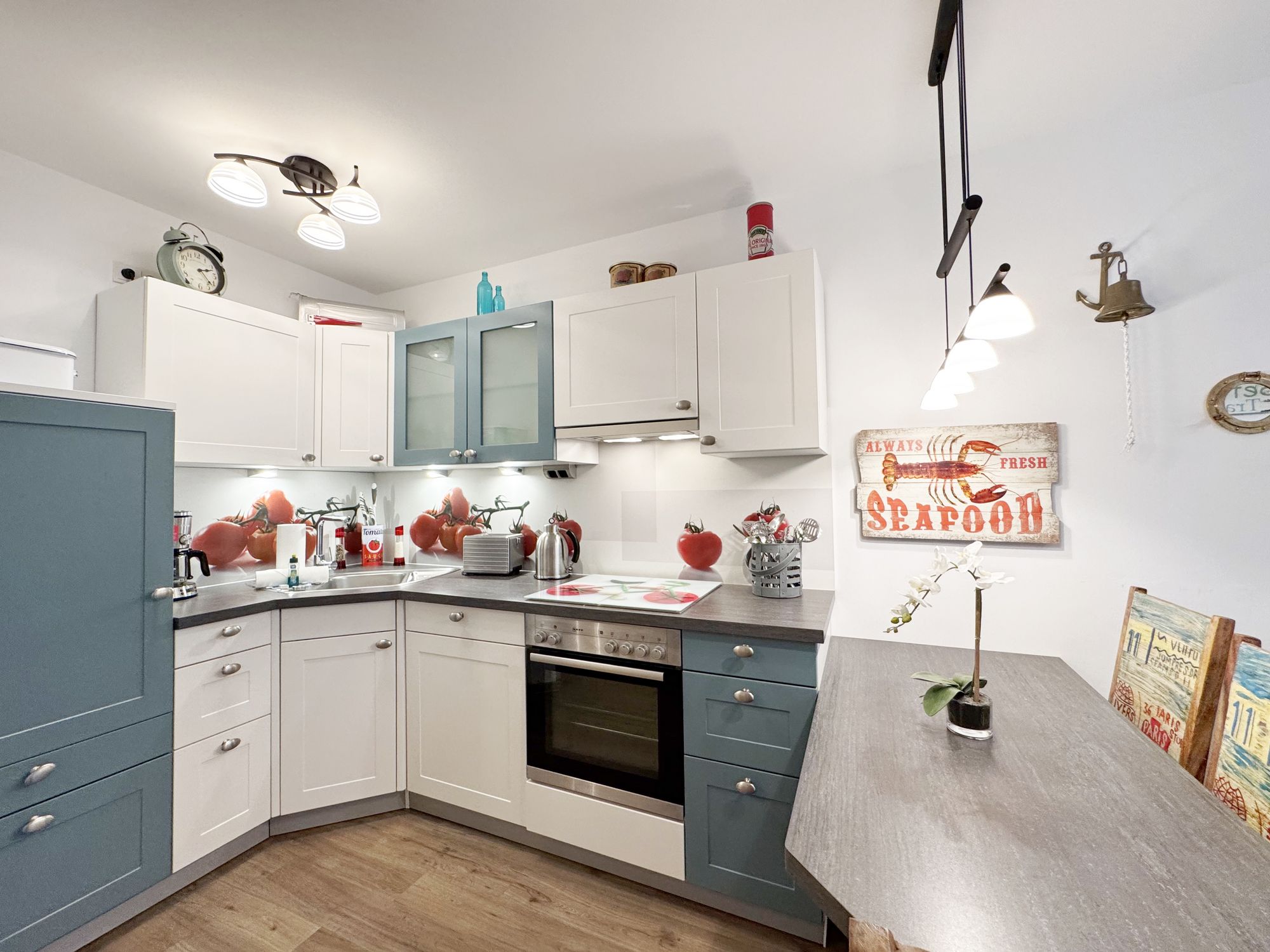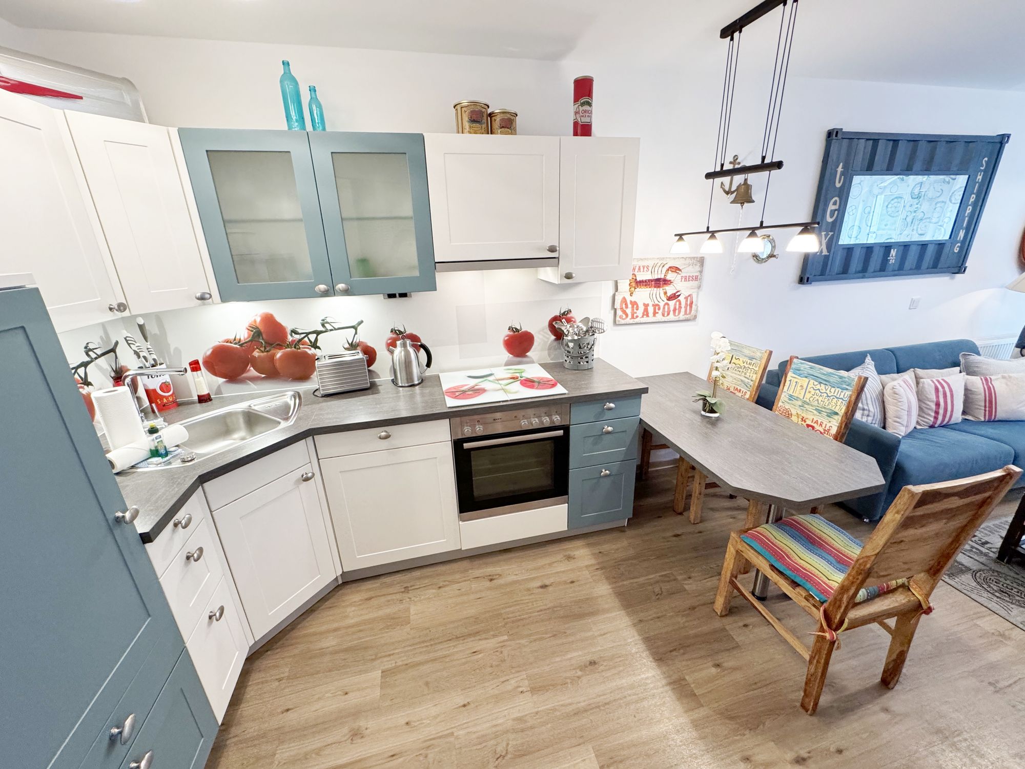 - integrierte Küchenzeile mit einem 4-Zonenkochfeld, Kühlschrank mit Gefrierfach, Geschirrspülmaschine, Kaffeemaschine, Toaster, Wasserkocher und anderen praktischen Küchenhelfern