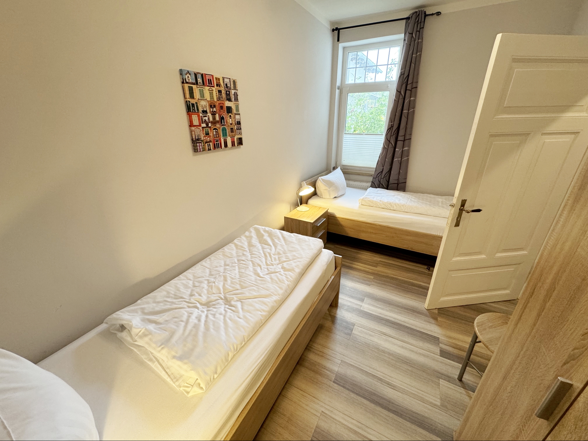 - Schlafzimmer mit 2 bequemem Einzelbetten (0,90 m x 2,00 m), Lichtquellen und Kleiderschrank