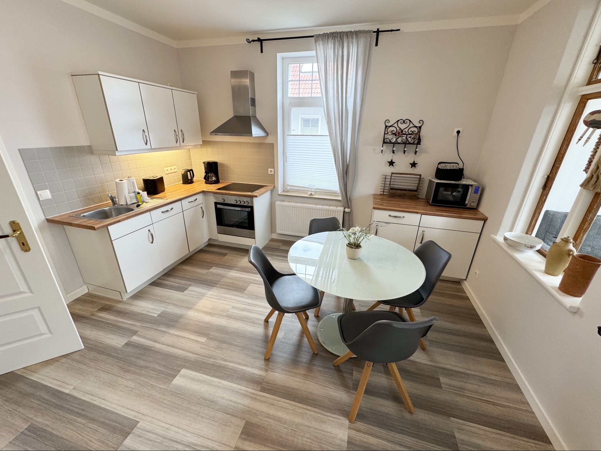 - Einbauküche mit Geschirrspüler, Ceranherd mit Backofen, Kühlschrank mit Gefrierfach, Kaffeemaschine, Wasserkocher, Toaster, Mikrowelle und diverse Küchenutensilien