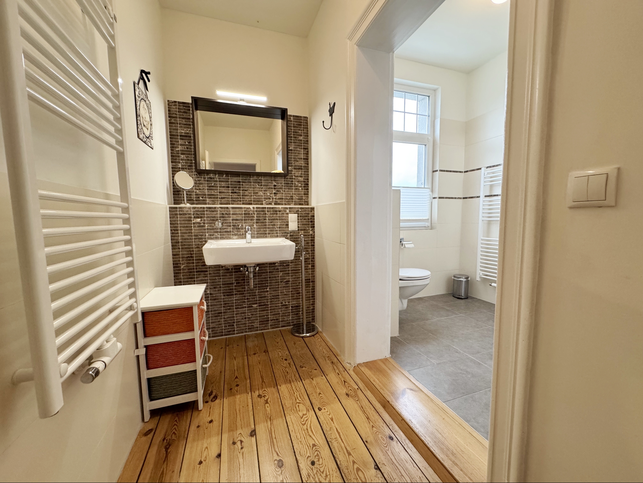 - Duschbad mit großem Waschtisch, Spiegel, Handtuchheizkörper, WC und Fön