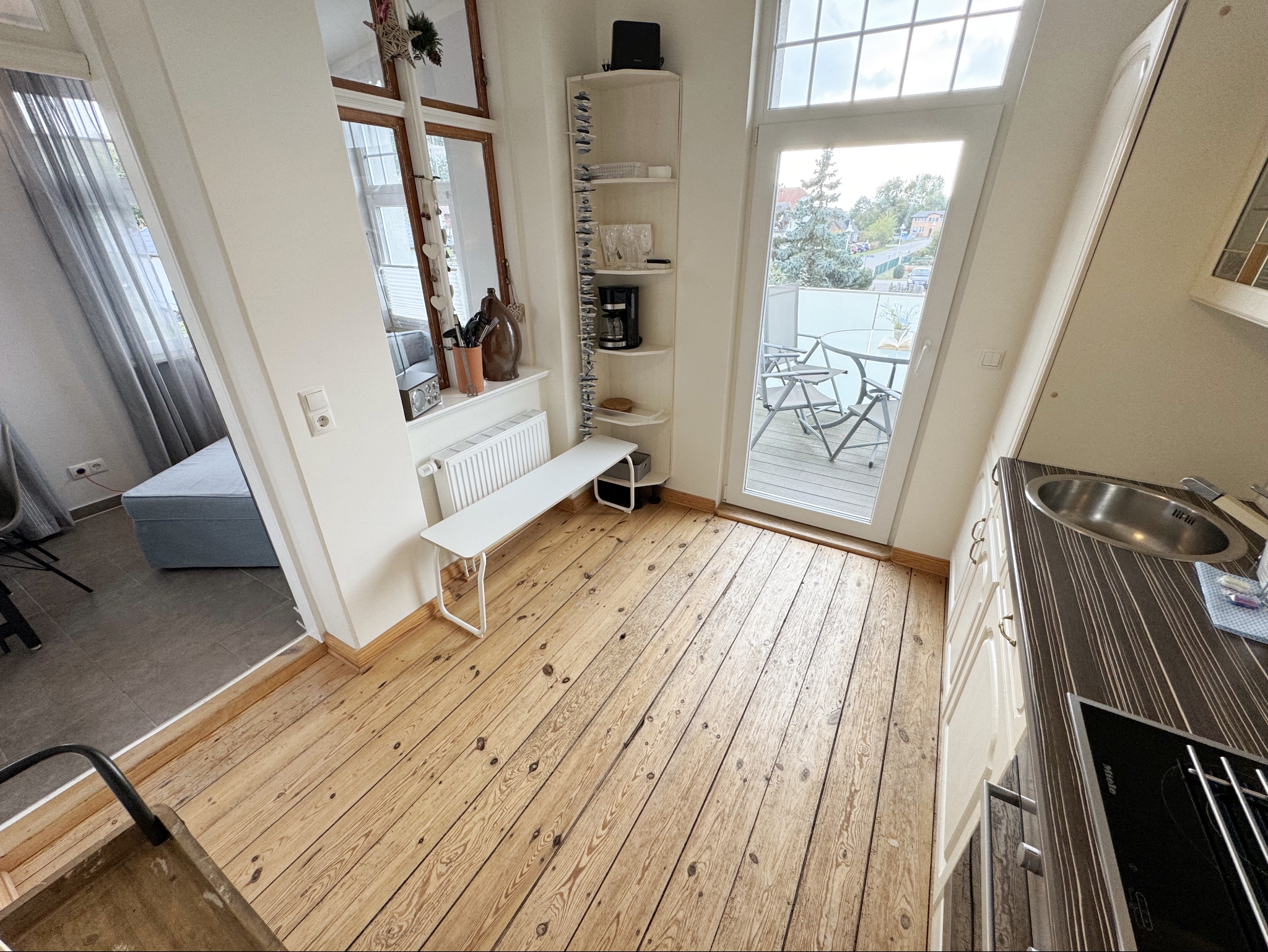 - Wohn-, Schlafzimmer, Küche und der Vorraum zum Bad mit altem Holzfußboden