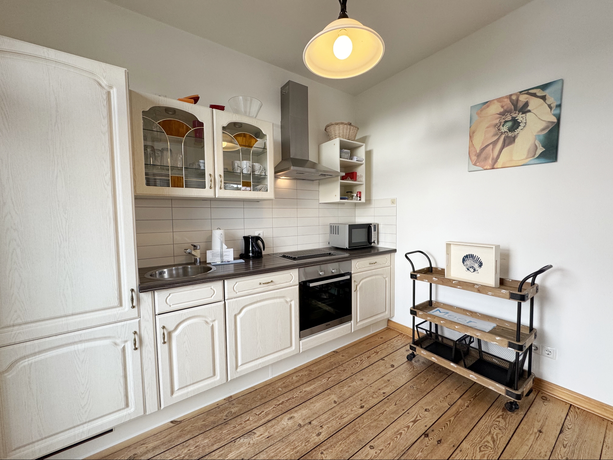 - moderne Küche mit Herd und Ceranfeld, Backofen, Geschirrspüler, Kühlschrank mit Gefrierfach, Wasserkocher, Toaster, Kaffeemaschine, Mikrowelle sowie diversen Küchenutensilien